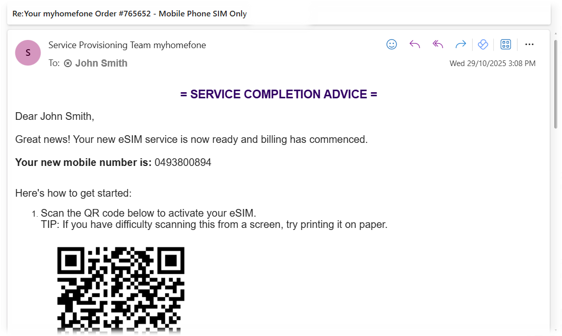 Once your MyHomeFone Mobile order has been processed, you’ll receive an email containing your unique eSIM QR code.